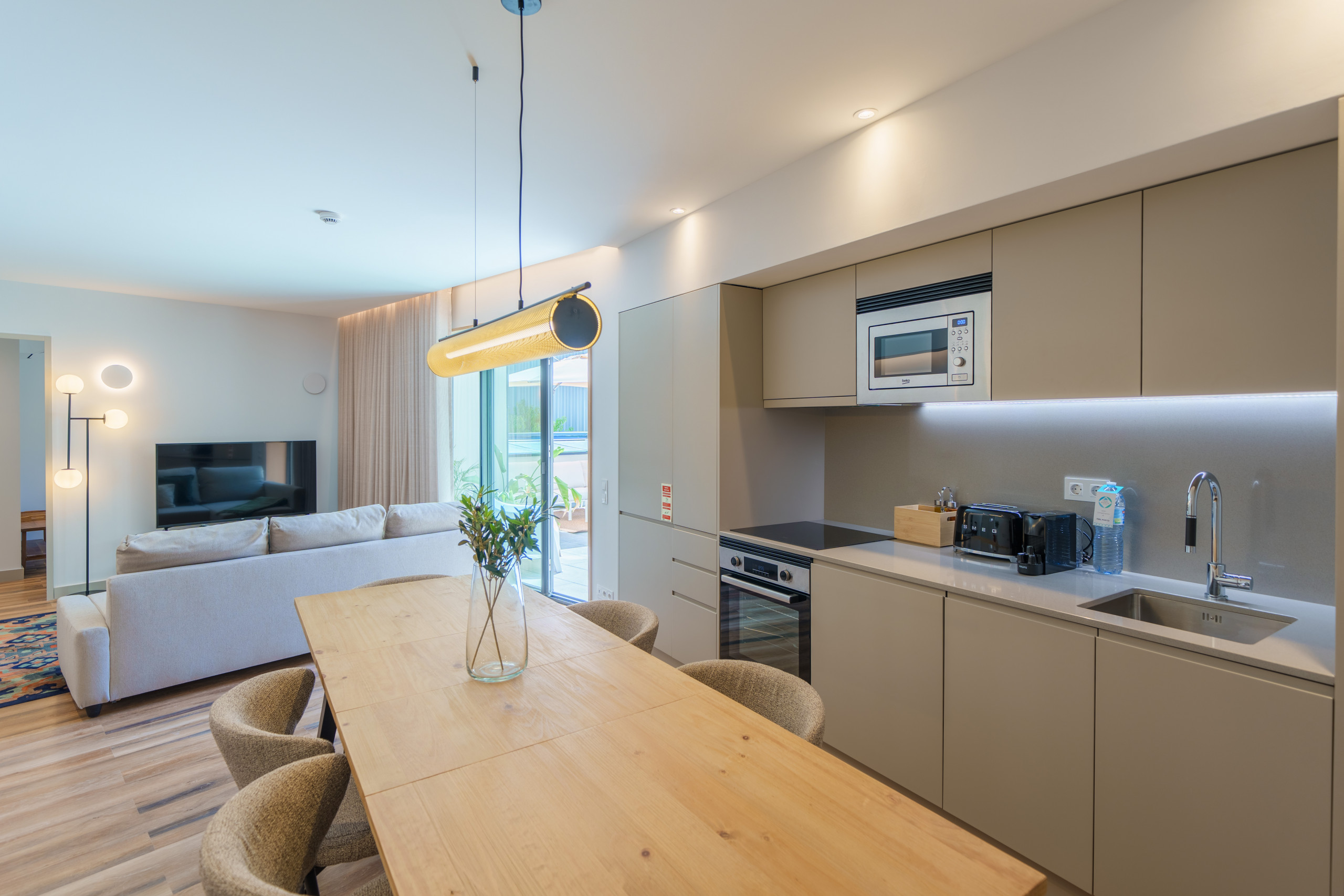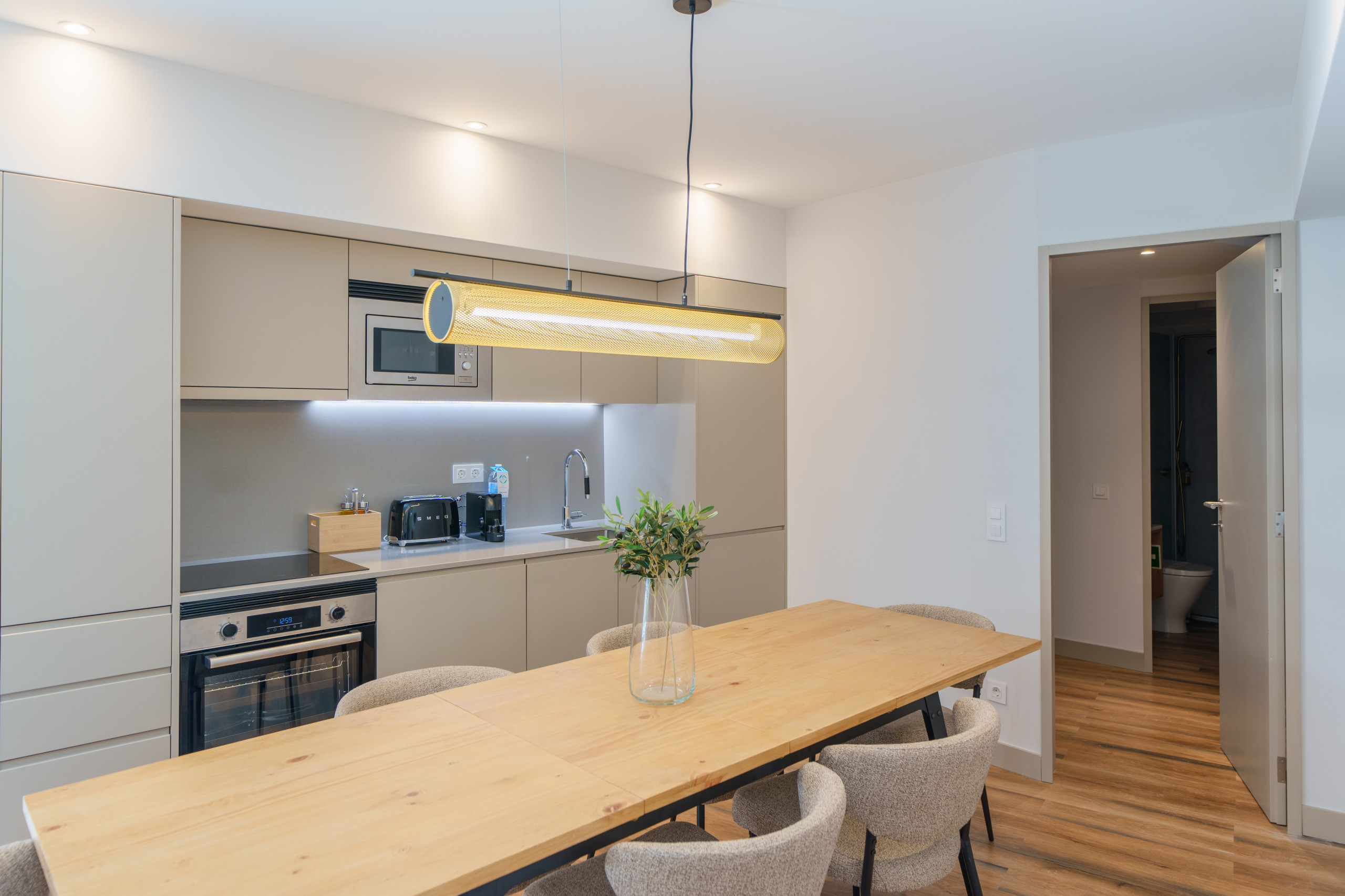 • Utensílios de cozinha, placa de indução, congelador, frigorífico, forno, jarro elétrico, torradeira, forno e micro-ondas